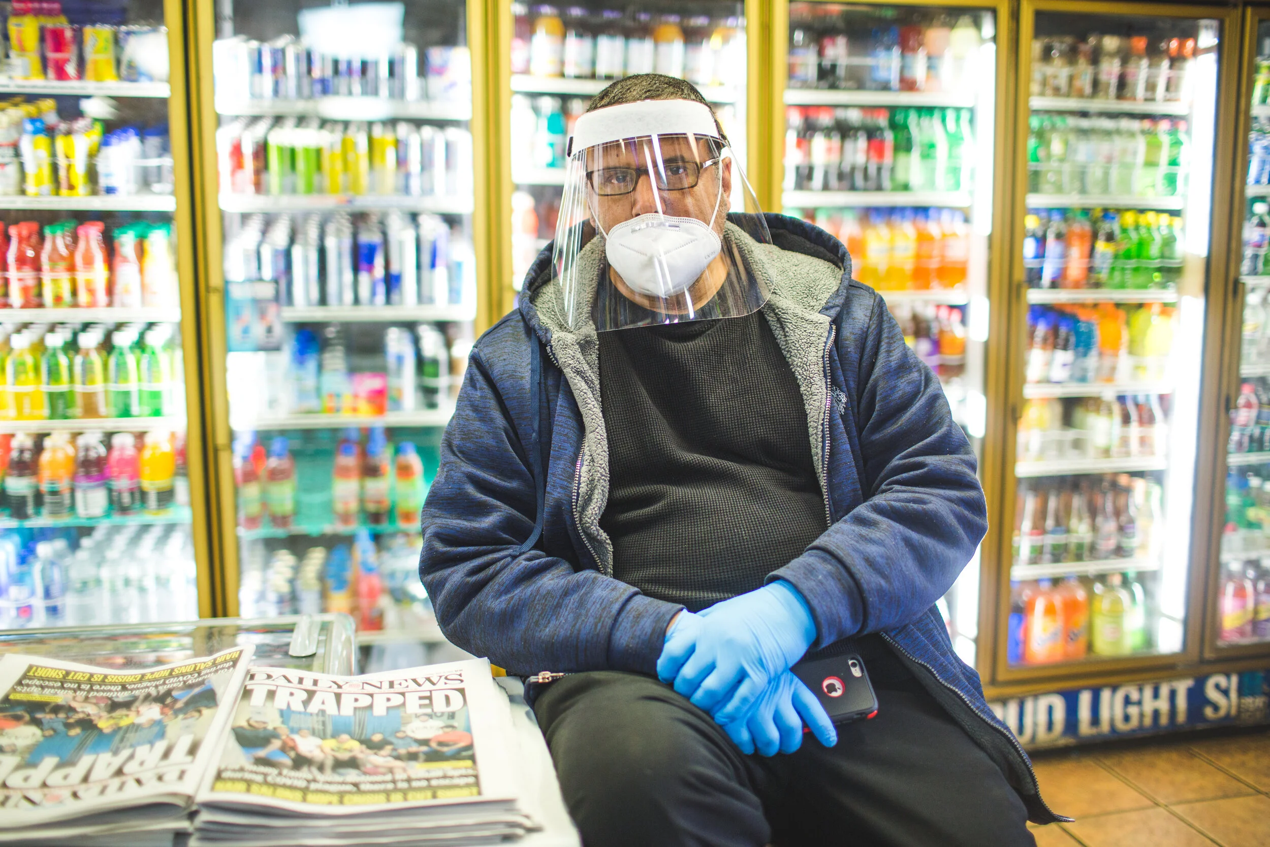 4/19/20 - Mutahar Emari, of Yemen, sits next to a stack of un-sold newspapers in the Livoni Deli in Brownsville, Brooklyn. He and his family have owned and managed the deli for over 30 years.